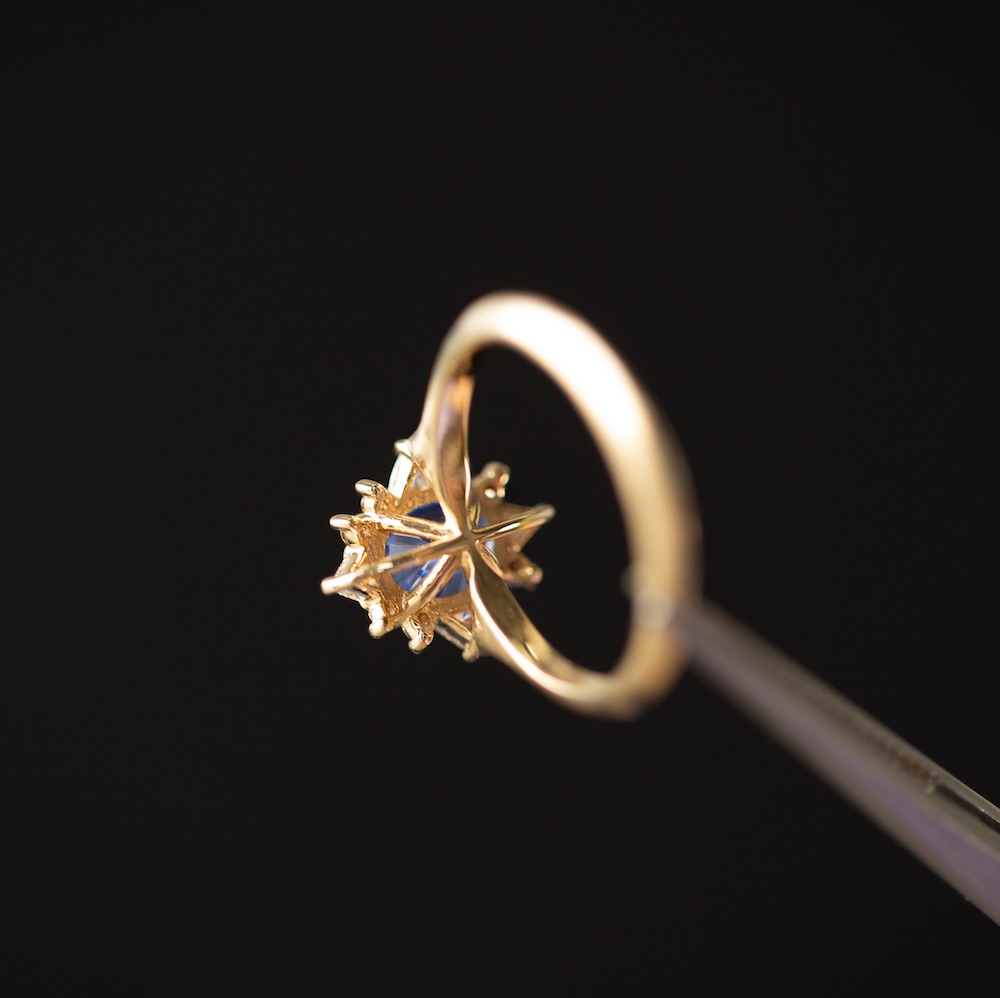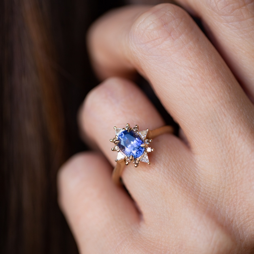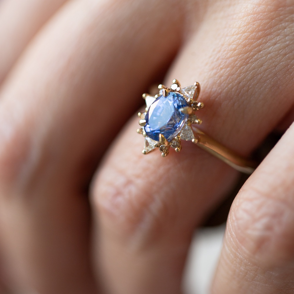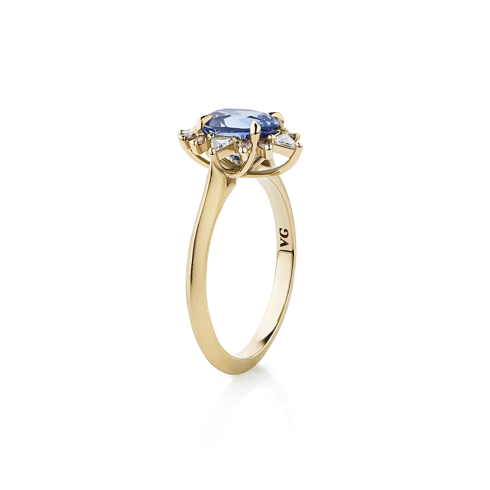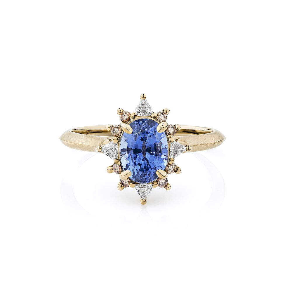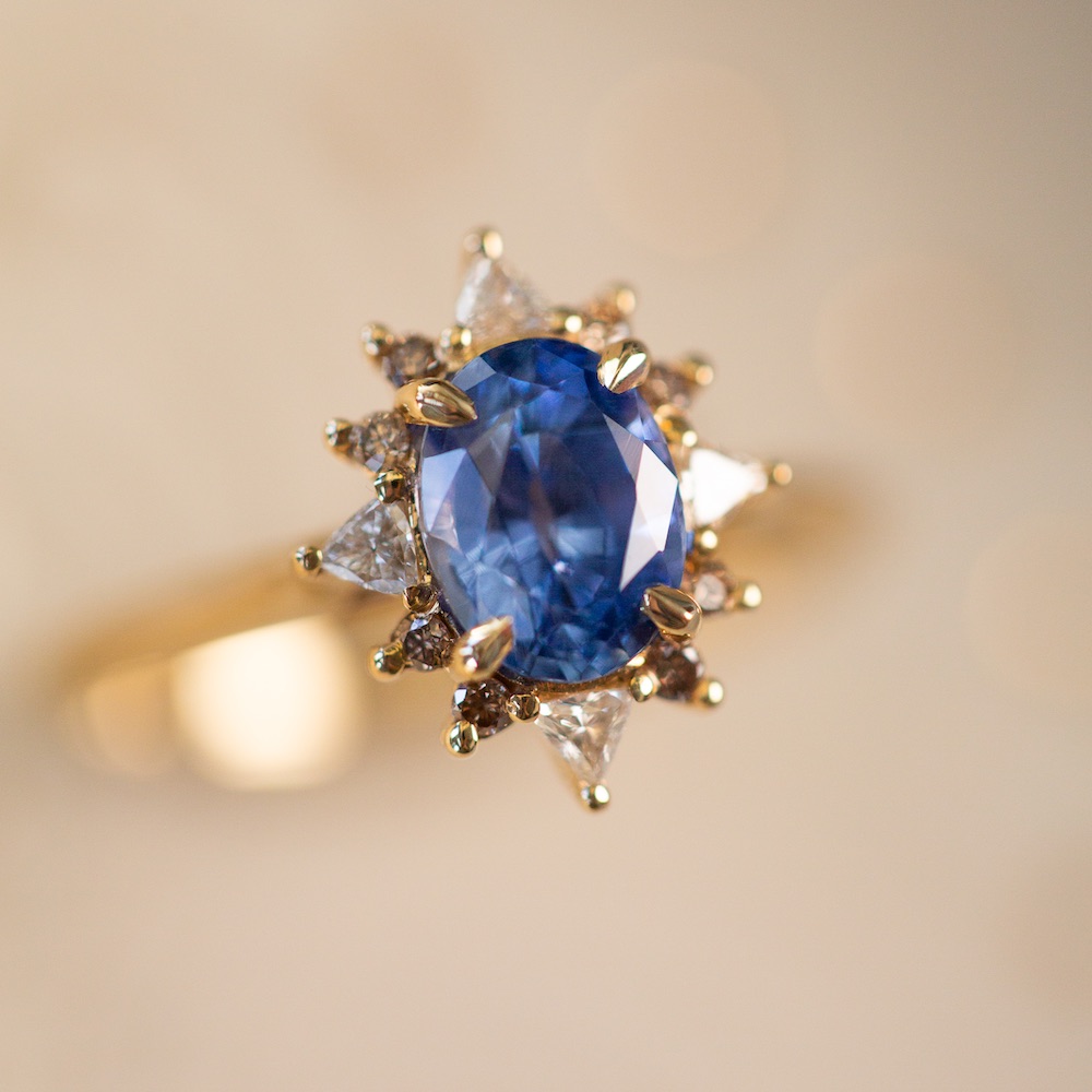 It has been intentionally crafted featuring a 1.7ct Oval Ceylon Sapphire, mid to bright blue in colouring. Surrounding the border are a mixture of trilliant and round White & Cognac earth grown Diamonds, almost like rays shining outwards. Equally, almost floral feeling. The 14k Yellow Gold band has upswept shoulders to allow for a straight wedding ring to nestle in.