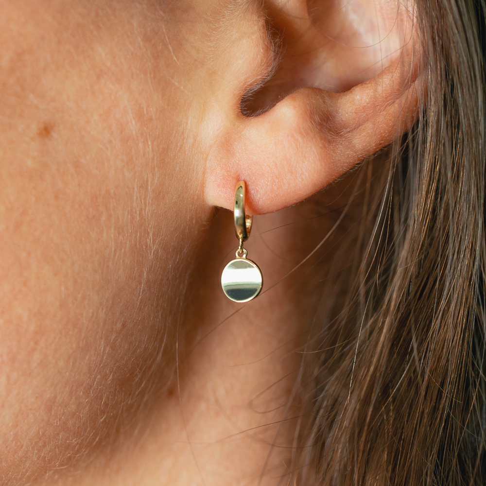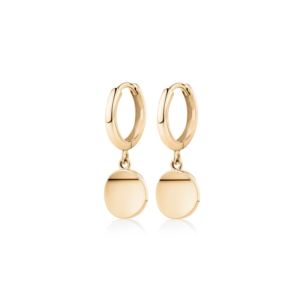 Meet your 9kt yellow gold pendant disc Huggies that catch and reflect the light. Ideal for lobe stacking, or worn solo.