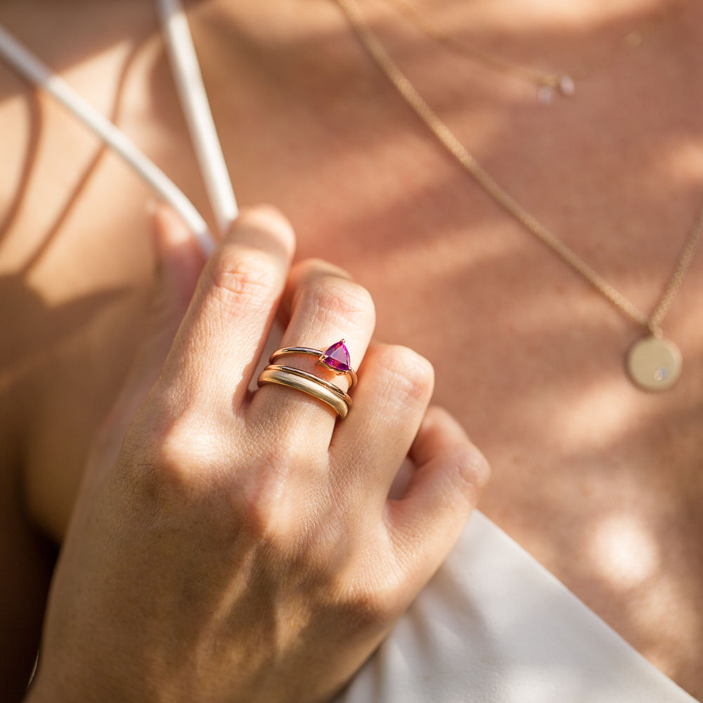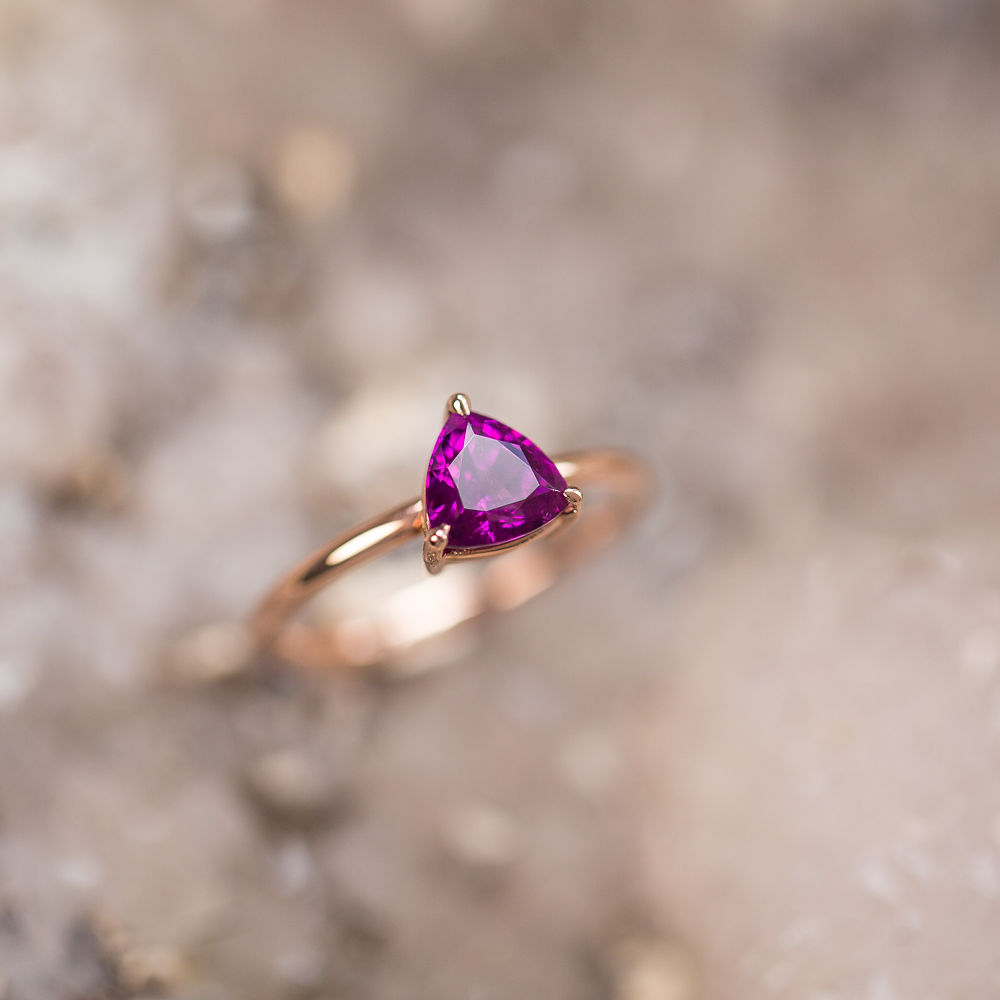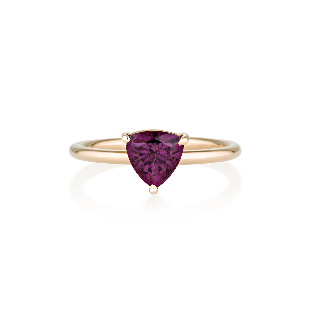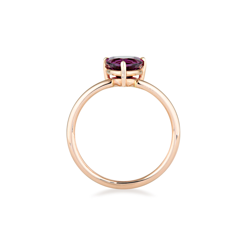 A purplish rose coloured Rhodolite Garnet, set in 14k Rose Gold. Garnet as a stone is warming, regenerating and nourishing.