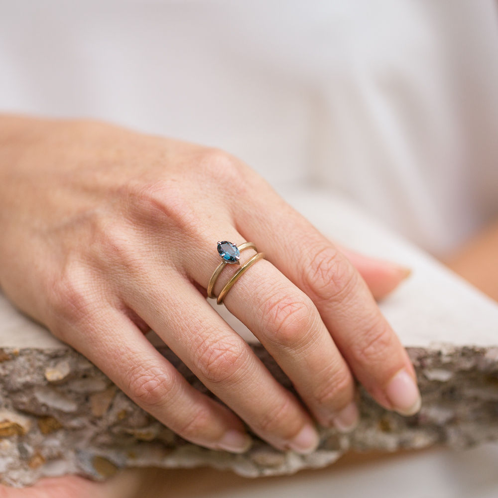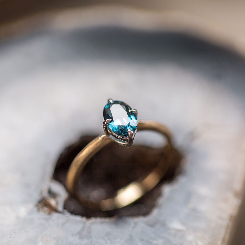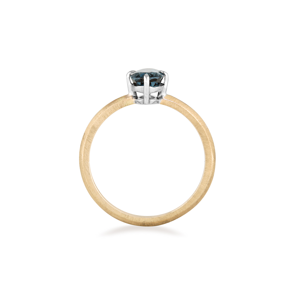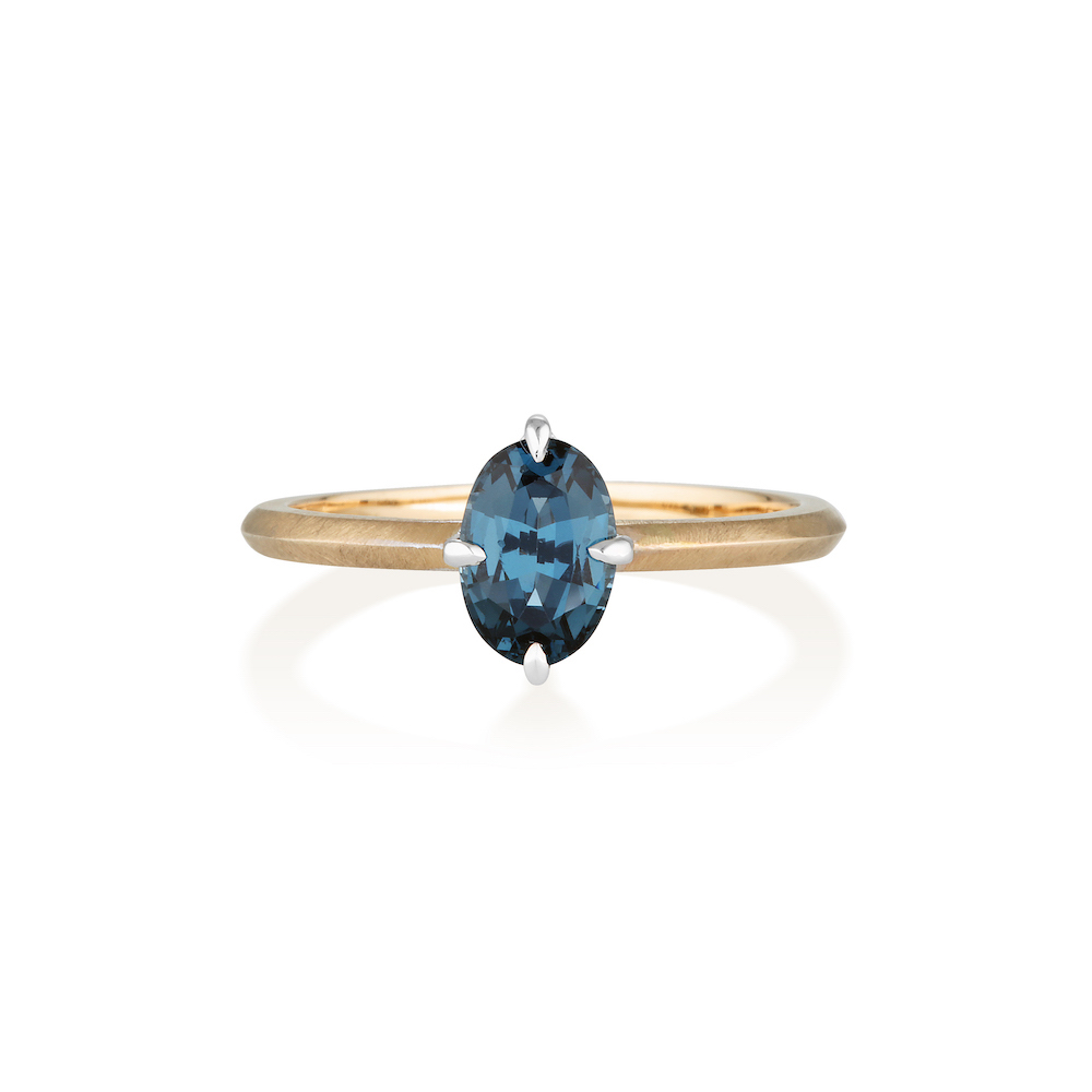1.07ct Blue Spinel, with a captivating depth in dark greyish-blue colour set in a combined 14k white and (matte finished) yellow gold.