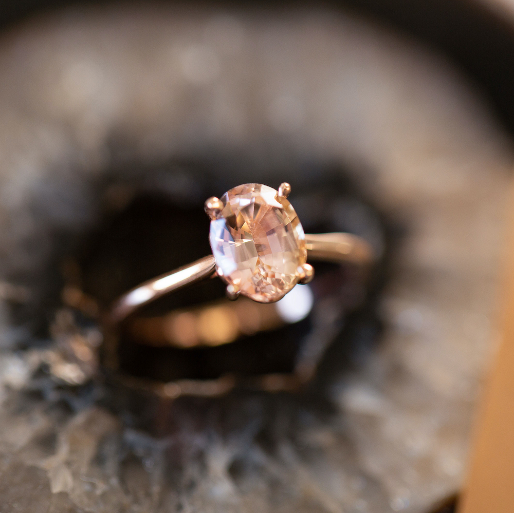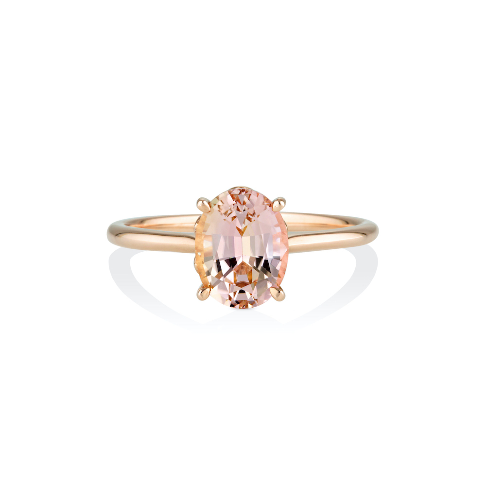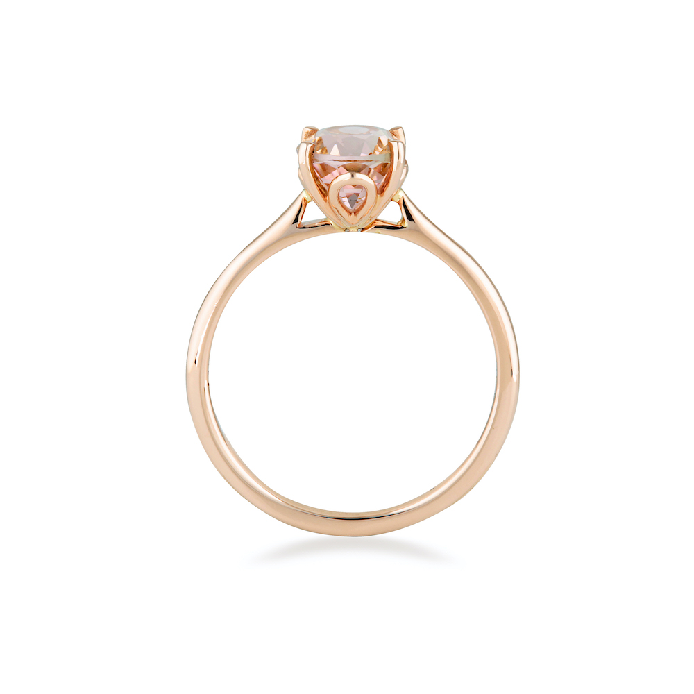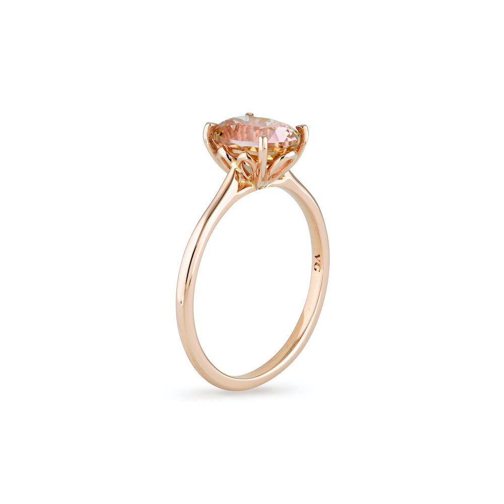 This unique 1.59ct bicoloured Tourmaline displays pink, yellow and orange hues depending on the angle and light. The 14k / 585 Rose Gold setting has been intentionally designed to resemble a blooming flower ~ with the petals splayed open to hold the stone in place. At the centre of this design (and hidden in the band)Â is a tiny, 1.3mm white Diamond.