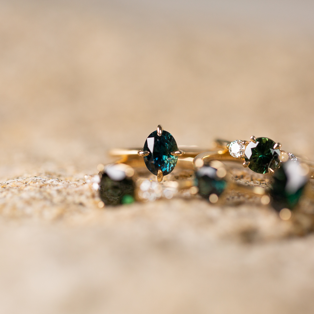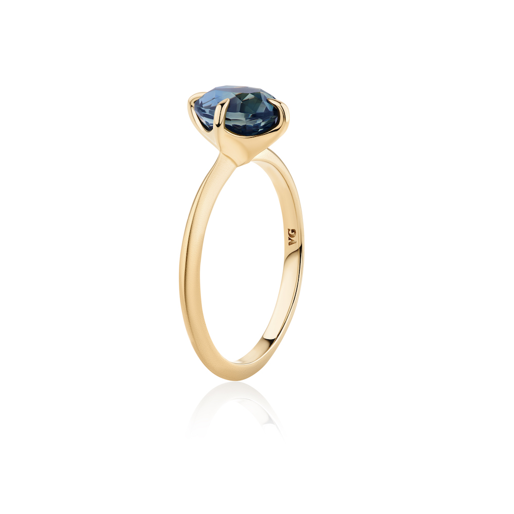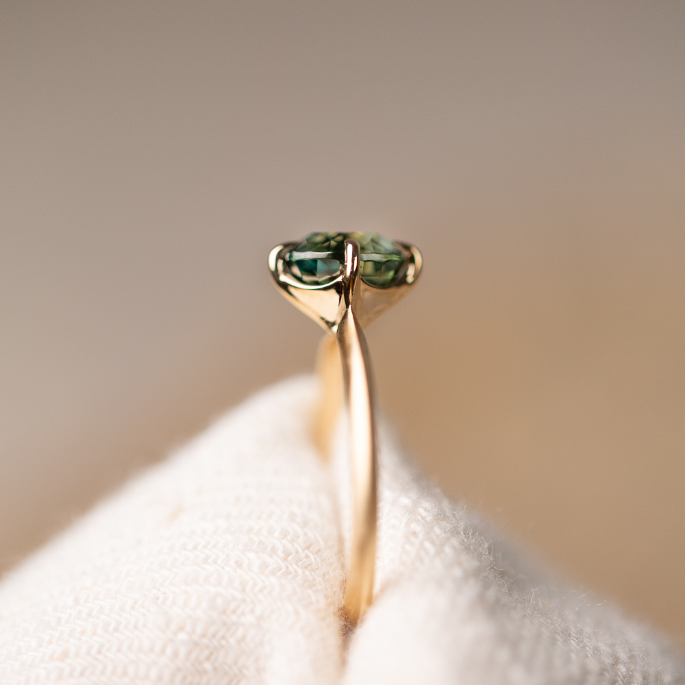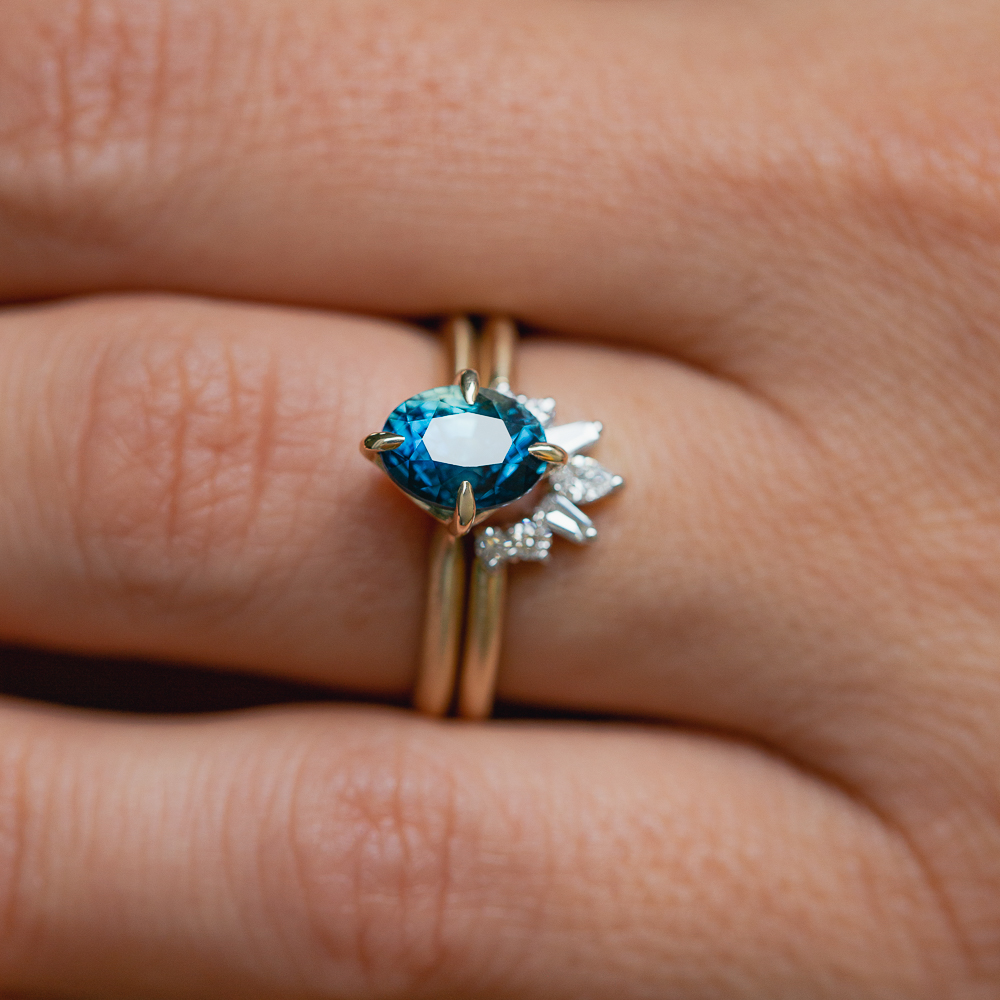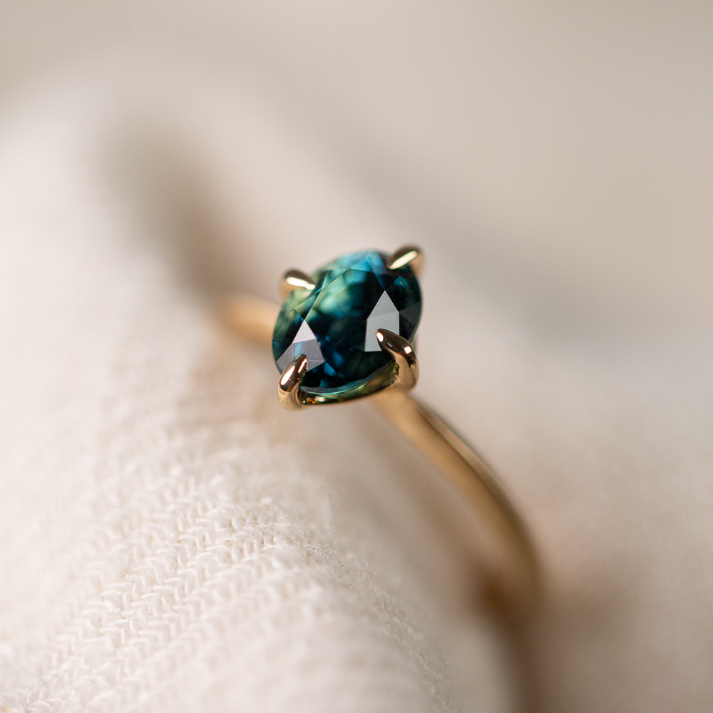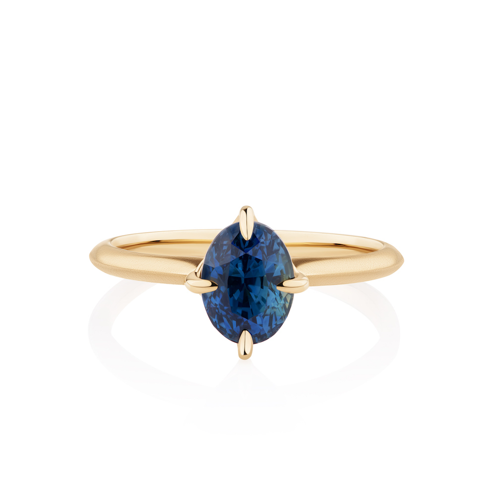 Your vibrant Peacock Madagascan Sapphire has been ethically sourced and cut, with no treatments. The four tapered claws have been intentionally placed at the N-E-S-W points and then combined with a matte finished  knife-edge band, which makes it feel modern and edgy.