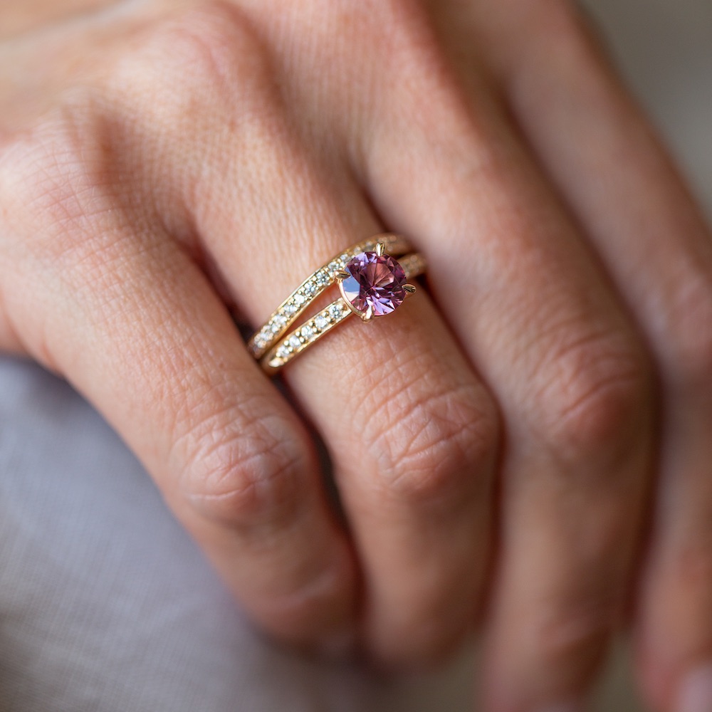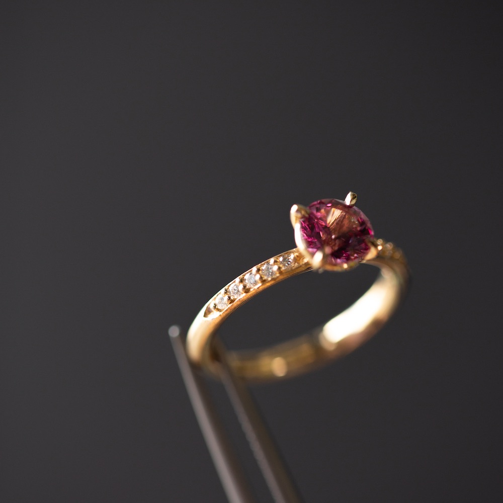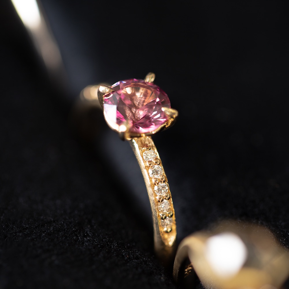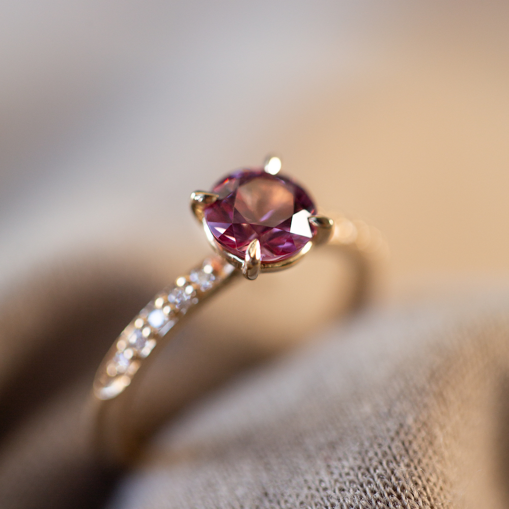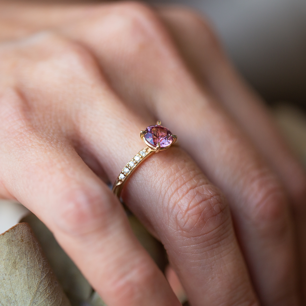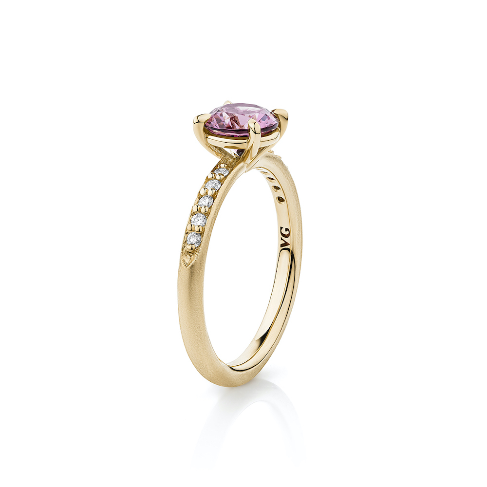 MEET DULCIE, your pink coloured Malaya Garnet and Diamond, 14k Australian Yellow Gold ring.
