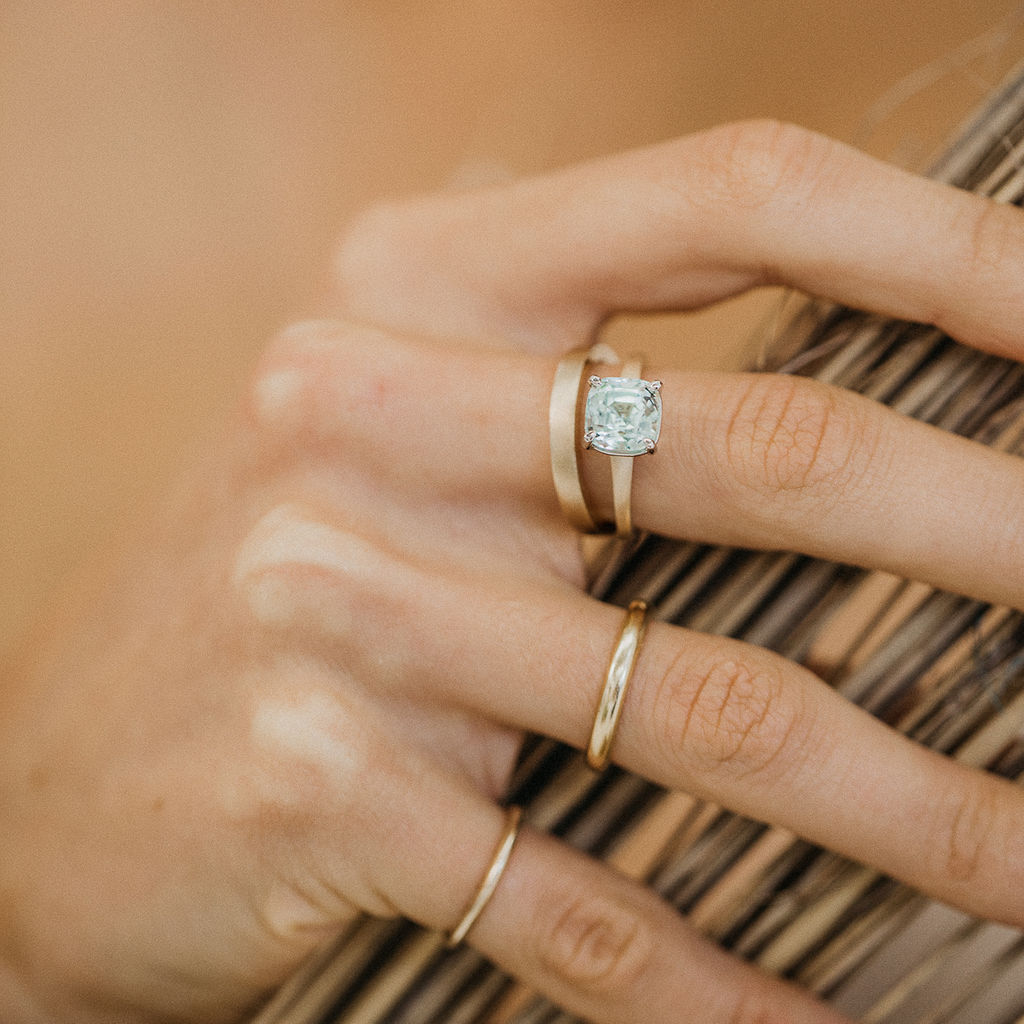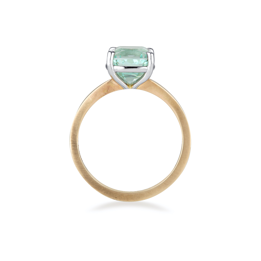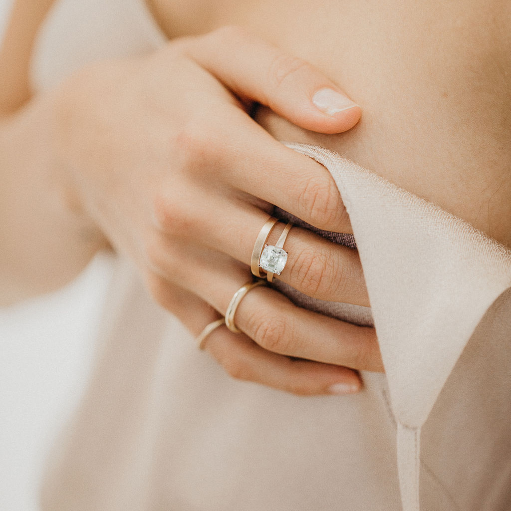 It is then surrounded by a matte finished, 14k / 585 Yellow Gold band creating contrast in colour, texture and overall feeling.