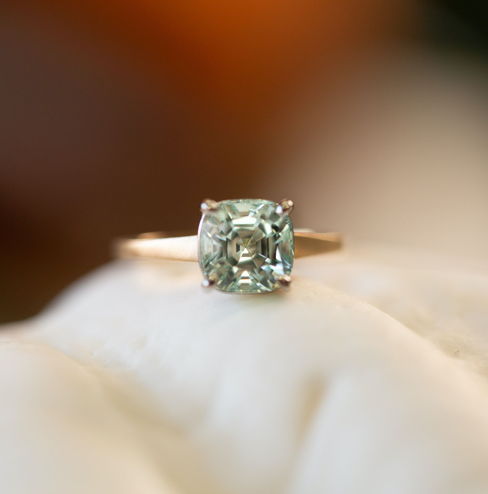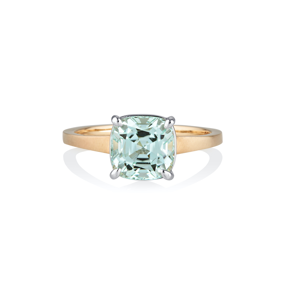 The 2.24ct square cushion cut Ice Blue Tourmaline has been intentionally set into Platinum, to allow the brightness of this enthralling stone to POP.