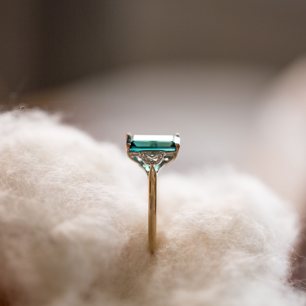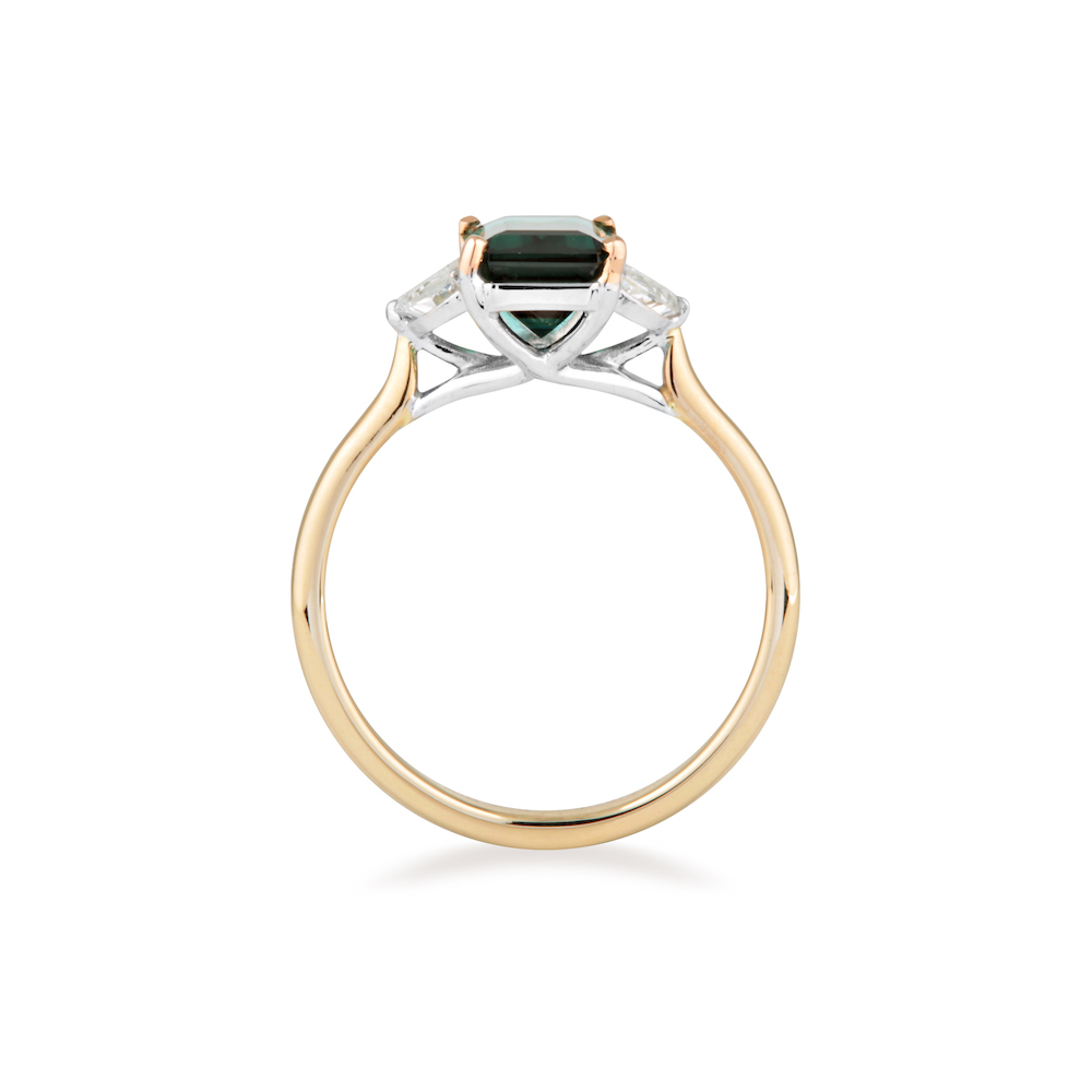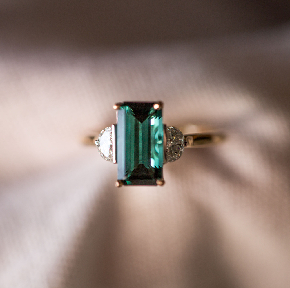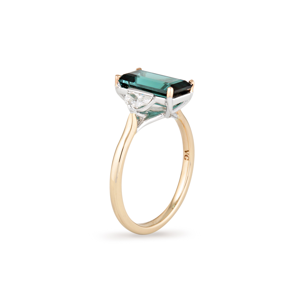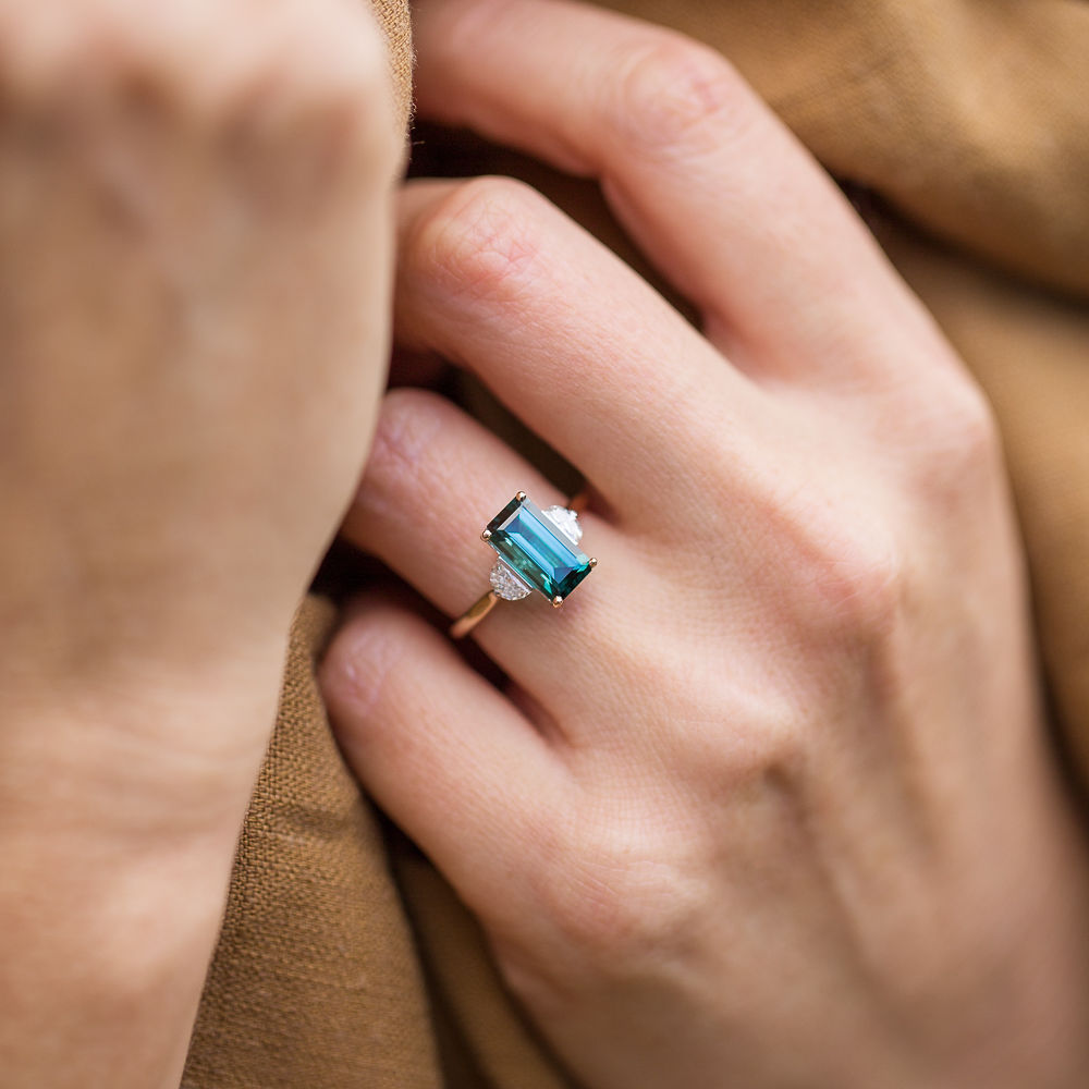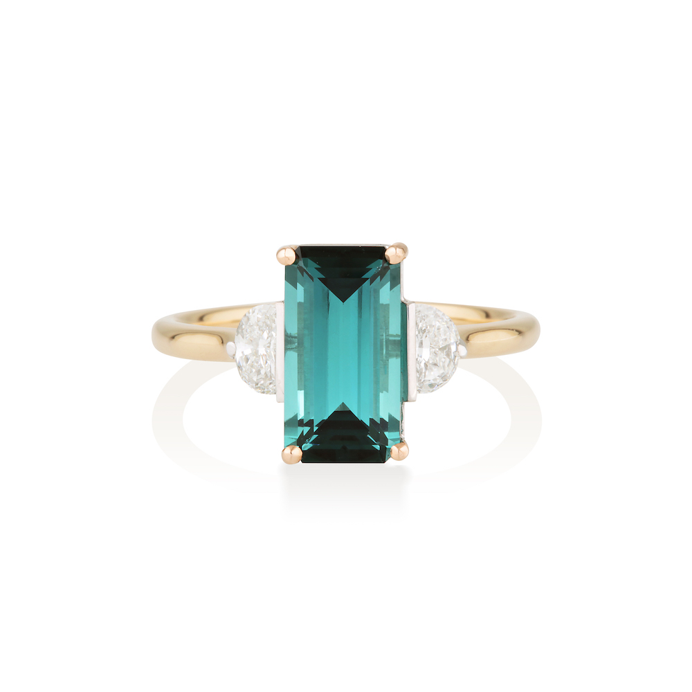 Combining a captivating and rich Indicolite Tourmaline with moon shaped Diamonds either side. Hidden diamonds lay behind the stone setting, like a sky full of stars included for personal guidance, protection and to carry all of your wishes.