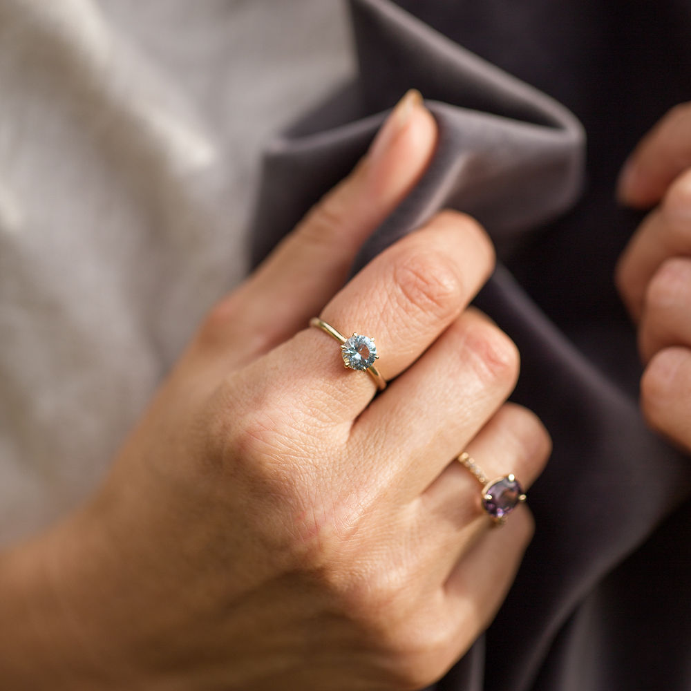 I have been a long time follower of Violet Gray, even all the way from Canada. I have been eyeing their gorgeous pieces for years and decided to do something to reward myself. I ordered Neli after working as a nurse for over a year in the pandemic to reward myself for the stress i had endured, as the blue calmness of Aquamarine felt soothing to my soul. I directly spoke with the team to have a power word engraved on the inside. The packaging was ethereal, like a dream when i opened it, the wood ring box amazingly crafted. The ring took my breath away. As a lover of nature, outdoors, and glistening water; this ring embodies it all. It matches the colour and vibe of all the things i love. Of course i can’t wear it to work, but putting it on in the morning on my days off is a ritual for me now. Thank you to Alex and the team for the incredible experience and a new lifelong favourite piece.
