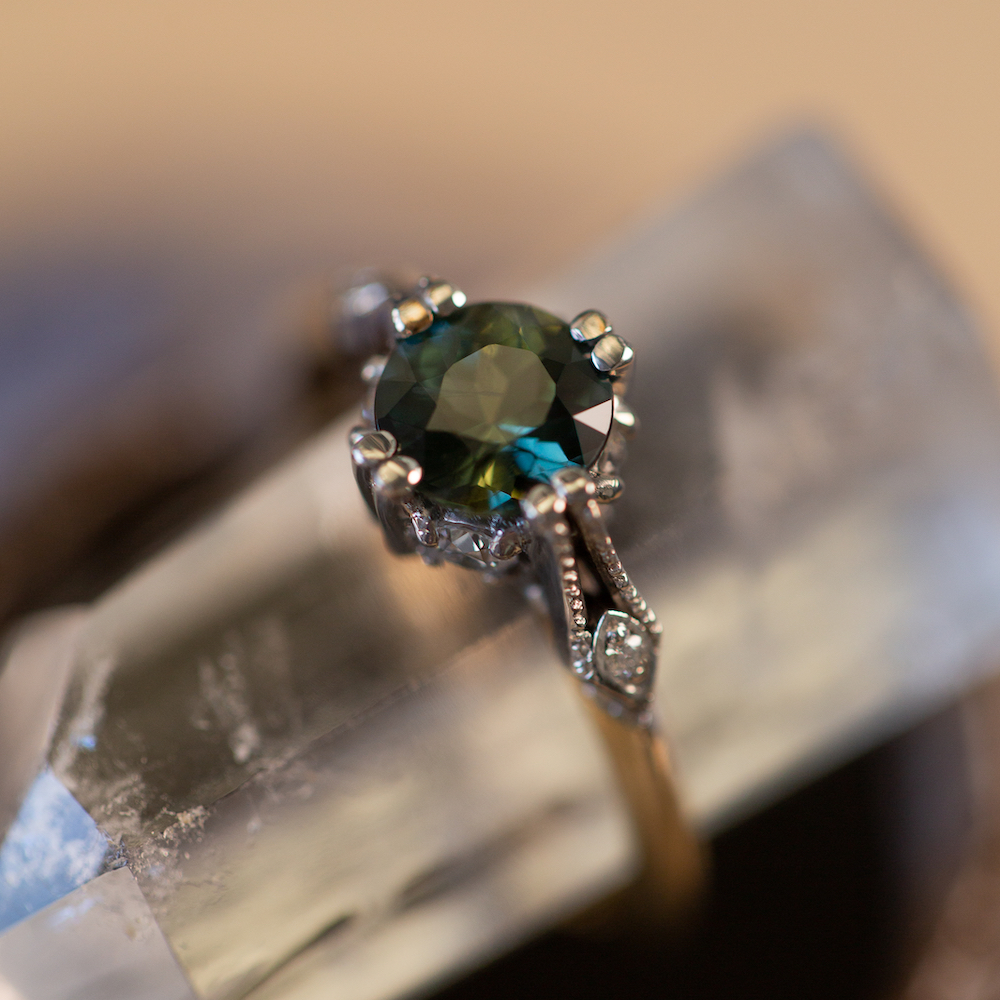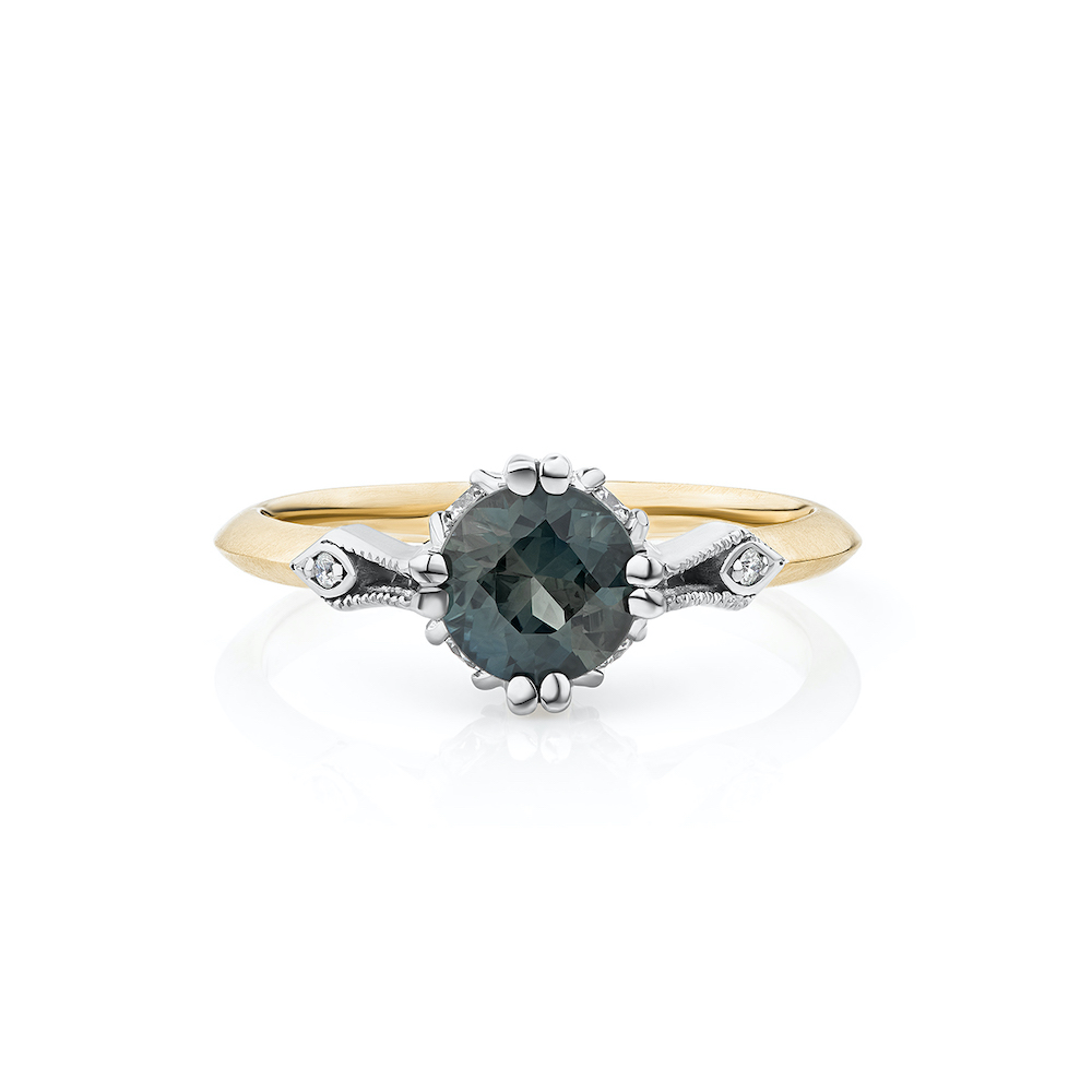 This new heirloom piece combines a 1.09ct round Australian Parti Sapphire, Diamond side detailing and combined 14k Yellow and White Gold metal. She feels old, but new. And ready for her story.