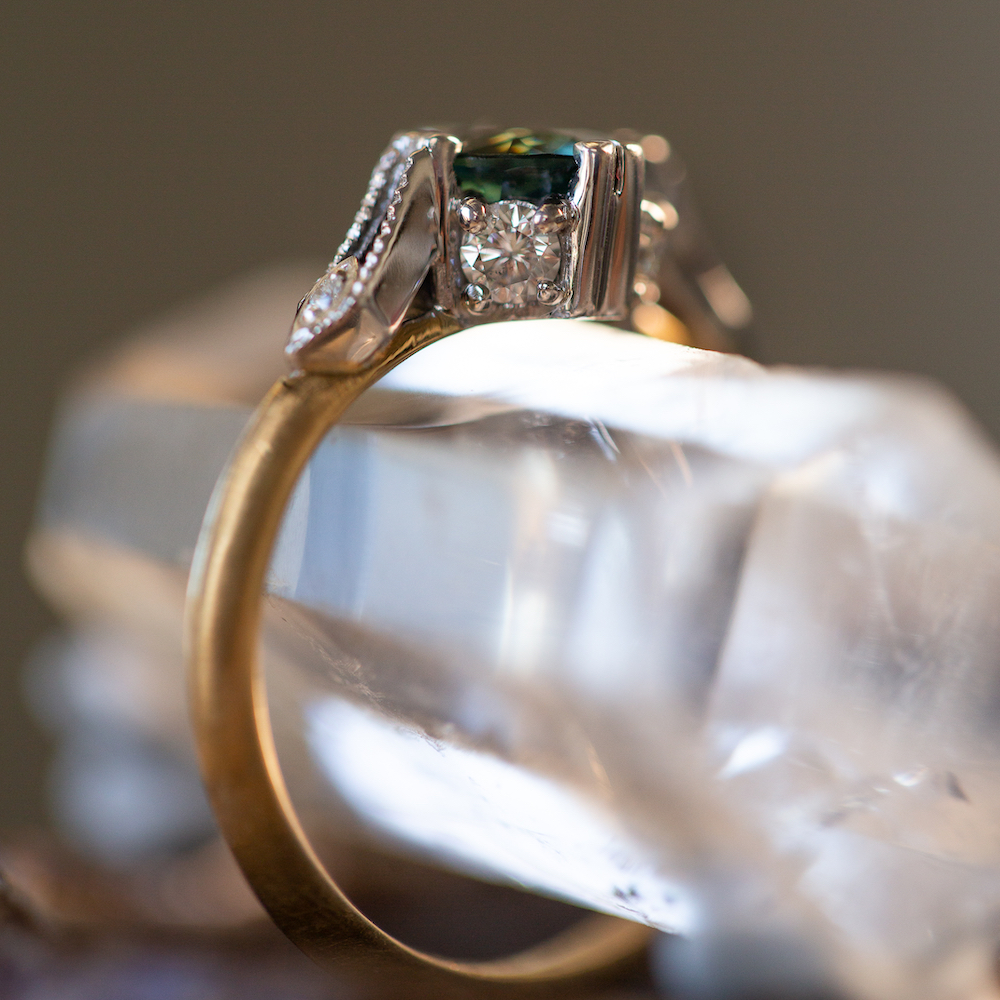 This new heirloom piece combines an Australian Parti Sapphire, Diamond side detailing and combined 14k Yellow & White Gold metal. She feels old, but new. And ready for her own story.